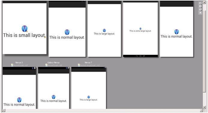- res/layout-large.xml → For large screen, its minimum resolution 640dpX480dp